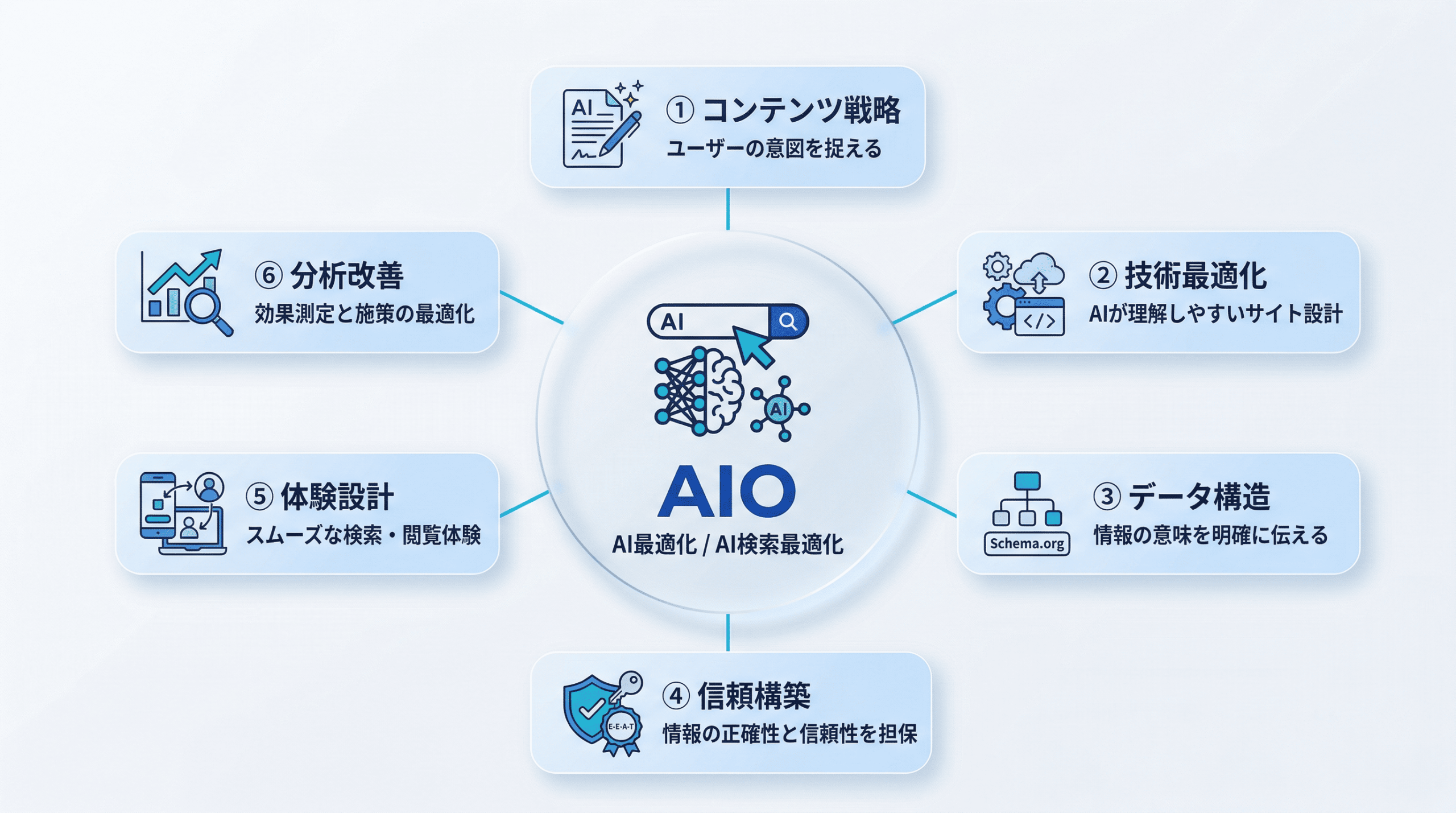 AIO対策は「AIがWebサイトの情報を正確かつ迅速に理解・評価できる状態」を作ることに帰着します。